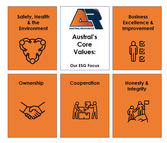 ESG refers to three interrelated factors expressed as standards for an organisation’s operational and corporate behaviour. Underpinned by the concept of sustainability, ESG is about achieving strong environmental, social and governance outcomes over a long term, common future. Austral formalised its ESG journey in 2022, with the development of an ESG Strategy and Program. Since then, Austral have continued to mature their ESG position through regular stakeholder engagement and the delivery of a number of ESG initiatives.