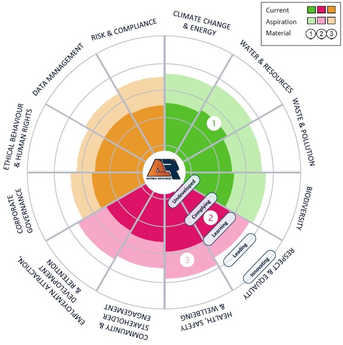 Between December 2022 and January 2023, Austral Resources conducted an ESG Stakeholder Sentiment survey to gauge stakeholder opinions on ESG priorities. The survey, distributed to 215 stakeholders and receiving 26 responses, covered 12 ESG themes. Respondents included internal staff, board members, suppliers, contractors, community members, and other stakeholders. The results of the survey informed AR's high-level ESG strategy and resource allocation for the subsequent ESG program that was developed.